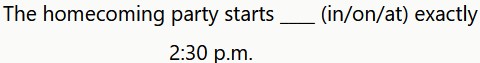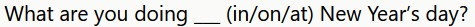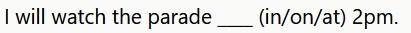 Los siguientes ejercicios te ayudarán a practicar las preposiciones de tiempo en inglés. Estos ejercicios tratan sobre días, meses, años, fechas, fines de semana, festividades, estaciones y horas del día. Incluye una hoja de ejercicios imprimible en pdf gratis.