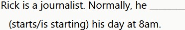 Rick es periodista. Normalmente, empieza el día a las 8 de la mañana.