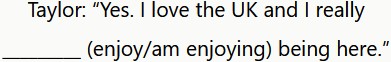 ℹ️ Utiliza el presente simple para expresar su opinión. No se trata de una opinión temporal, sino de un sentimiento más fijo. El presente continuo es posible, pero suena más temporal.