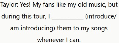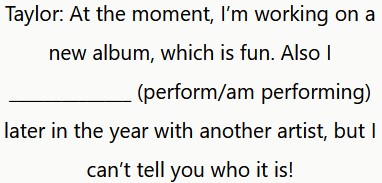 Taylor: Ahora estoy trabajando en un nuevo álbum, lo cual es divertido. También voy a actuar a finales de año con otro artista, ¡pero no puedo decirte quién es!