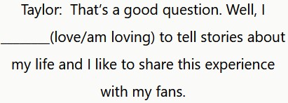 Taylor: Esa es una buena pregunta. Bueno, me encanta contar historias de mi vida y me gusta compartir esta experiencia con mis fans.