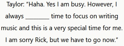 Taylor: «HaHa. Sí, estoy ocupado. Sin embargo, siempre saco tiempo para centrarme en escribir música y este es un momento muy especial para mí. Lo siento Rick, pero tenemos que irnos ya».