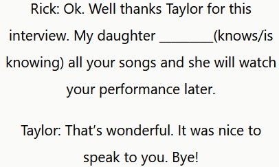 Rick: Ok. Bueno, gracias Taylor por esta entrevista. Mi hija se sabe todas tus canciones y verá tu actuación más tarde.