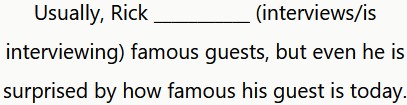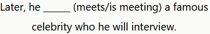 Este ejercicio muestra un día en la vida de un periodista que conoce a una “celebrity”. Tienes que elegir entre el presente simple y el presente continuo.