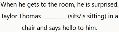 Cuando llega a la habitación, se sorprende. Taylor Thomas está sentado en una silla y le saluda.