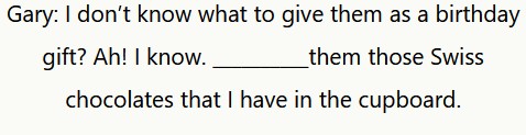 Gary: Non so cosa regalare loro per il compleanno? Ah! Lo so. Gli regalerò quei cioccolatini svizzeri che ho nella credenza.