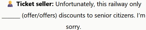 🧑💼Venditore di biglietti: Purtroppo questa ferrovia offre sconti solo agli anziani. Mi dispiace.