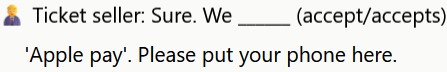🧑💼Venditore di biglietti: Certo. Accettiamo “Apple pay”. Metta qui il suo telefono.