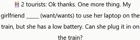 👫2 turisti: Ok, grazie. Un’altra cosa. La mia ragazza vuole usare il suo portatile sul treno, ma ha la batteria scarica. Può collegarlo sul treno?