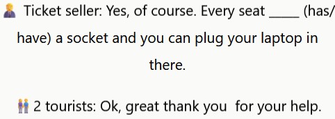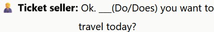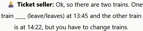 🧑💼Il venditore di biglietti: Ok, ci sono due treni. Uno parte alle 13:45 e l’altro alle 14:22, ma lei deve cambiare treno.