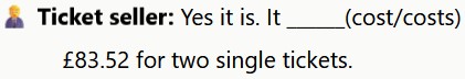 🧑💼 Venditore di biglietti: Sì, è così. Costa 83,52 sterline per due biglietti singoli.