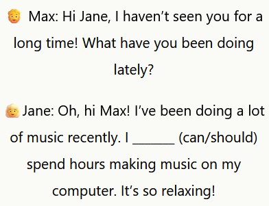 Questa pagina contiene una raccolta di diversi esercizi sui verbi modali con domande a risposta multipla basate su conversazioni naturali. Tutto è gratuito e puoi anche scaricare gratuitamente dei fogli di lavoro in formato pdf stampabili da questa pagina.