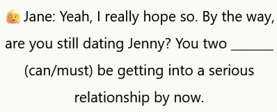 ℹ️ Jane usa “must” per esprimere una probabilità logica. Ritiene che la relazione di Max sia probabilmente seria, visto il tempo trascorso insieme a Jenny.