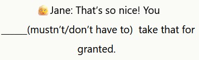 ℹ️ Jane usa il termine “mustn’t” per esprimere un forte divieto di fare qualcosa.ℹ️ In inglese si usa l’espressione “take something for granted” quando non si apprezza qualcosa perché si dà per scontato che ci sarà sempre.