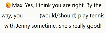 🧔Max: Sì, credo che tu abbia ragione. A proposito, dovresti giocare a tennis con Jenny qualche volta. È davvero brava!