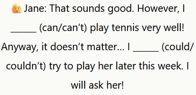 👱♀️Jane: Sembra una buona idea. Tuttavia, non so giocare a tennis molto bene! Comunque, non importa… Potrei provare a giocare con lei questa settimana. Glielo chiederò!