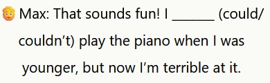 ℹ️”Could” si usa per esprimere un’abilità passata. Max sta parlando della sua capacità di suonare il pianoforte in passato.