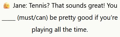 ℹ️ Usiamo “must” per esprimere una probabilità logica basata su prove. Jane ritiene che Max sia probabilmente bravo a tennis grazie al suo intenso allenamento.