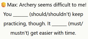 ℹ️ Max dice “should” perché sta dando un consiglio.ℹ️ Usa “must” per esprimere una probabilità logica, perché crede che la pratica del tiro con l’arco diventerà più facile.