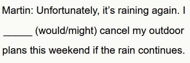 ℹ️ Il verbo modale “might” esprime una possibile decisione dovuta all’incertezza delle condizioni meteorologiche.