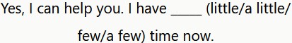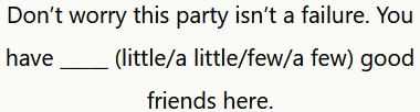 Zarówno „a few”, jak i „a little” oznaczają „trochę” i wskazują na niewielką ilość czegoś. „A few” i „a little” zazwyczaj wyrażają pozytywne znaczenie i uczucia. 🙂